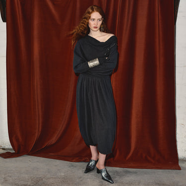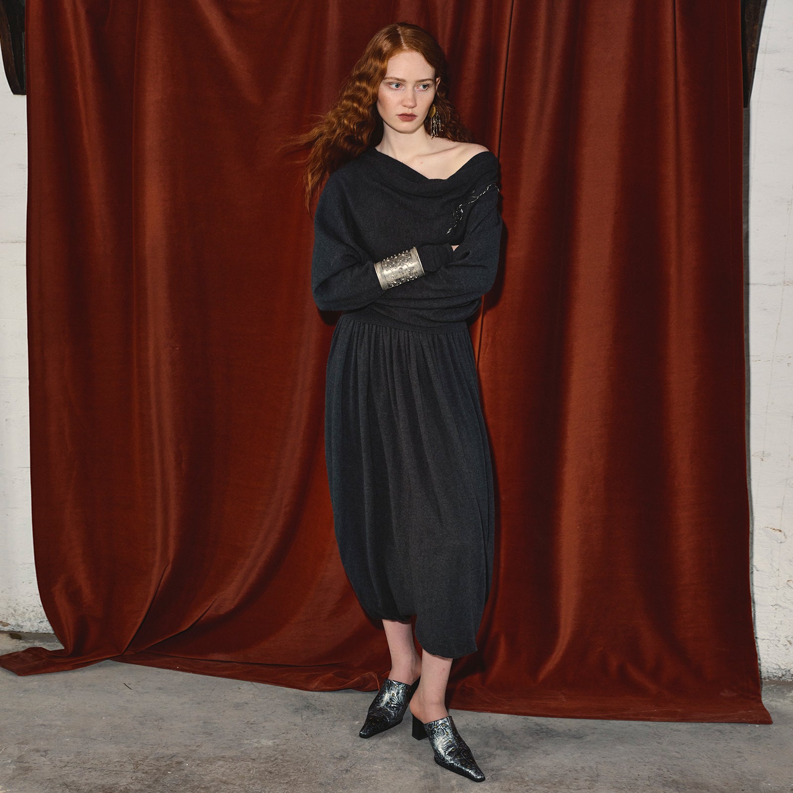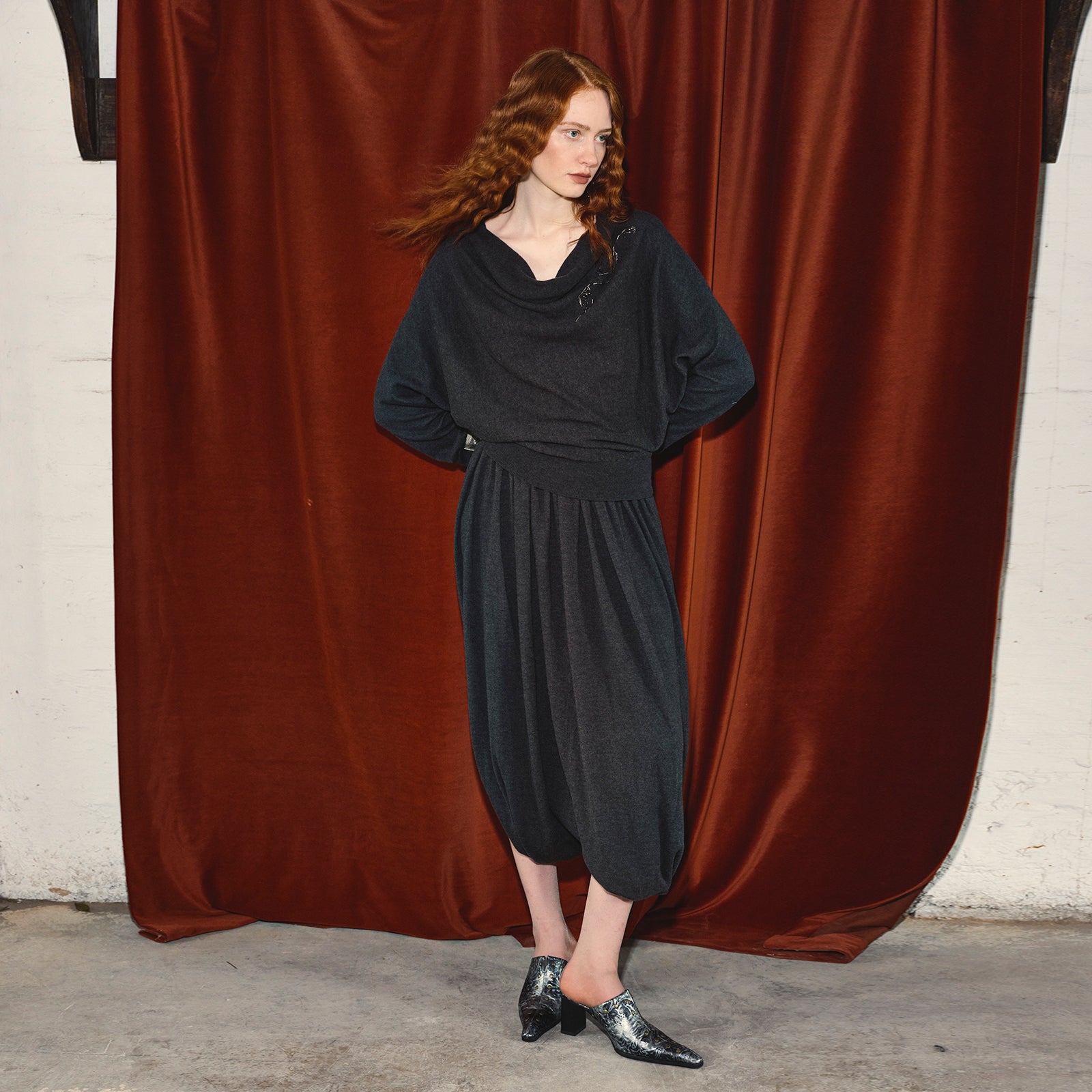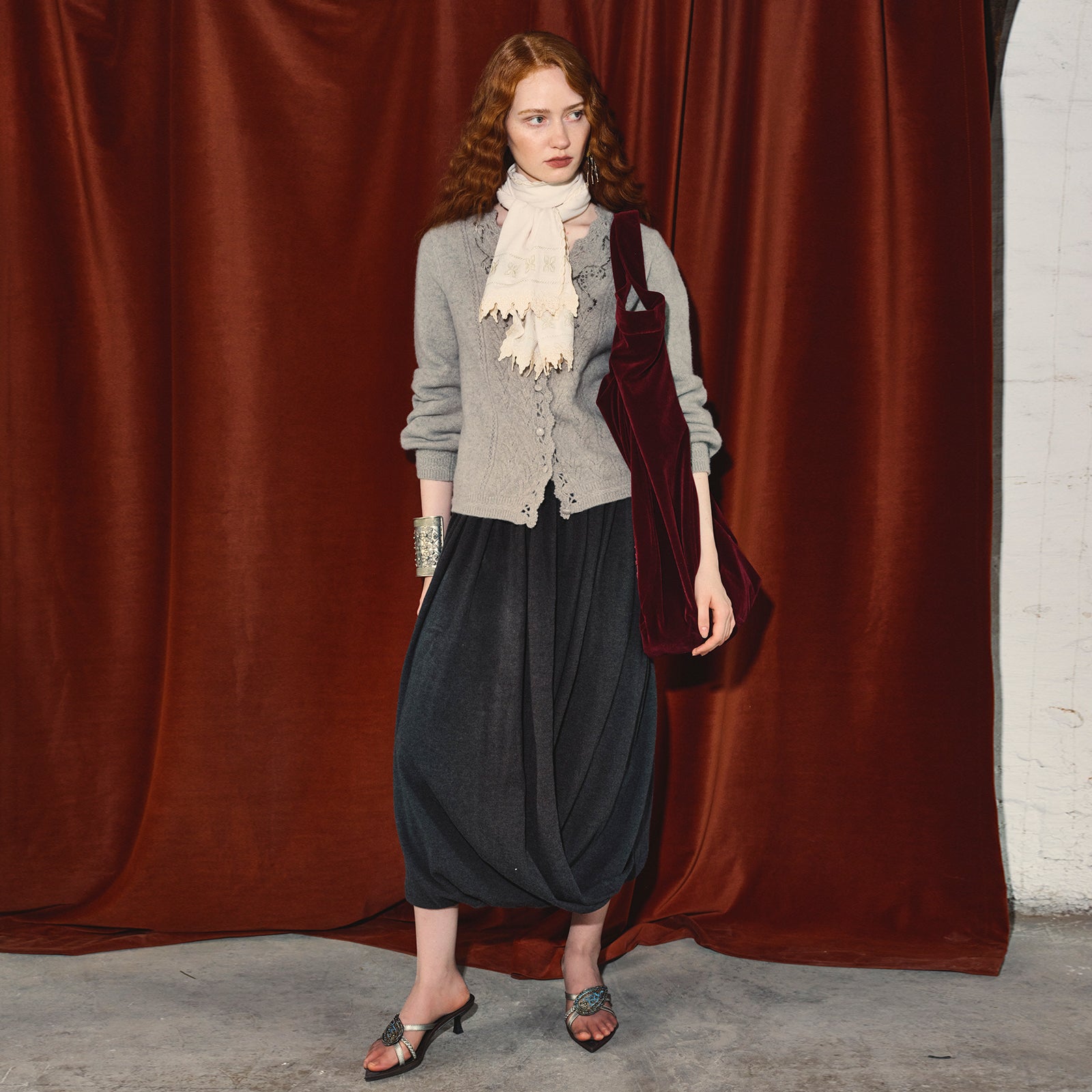 A 100% wool two-piece set featuring a sculpted knit top with hand-beaded details, paired with a twisted-knit skirt. The coordinated design balances structure and softness, offering refined texture and versatile styling for autumn/winter.
